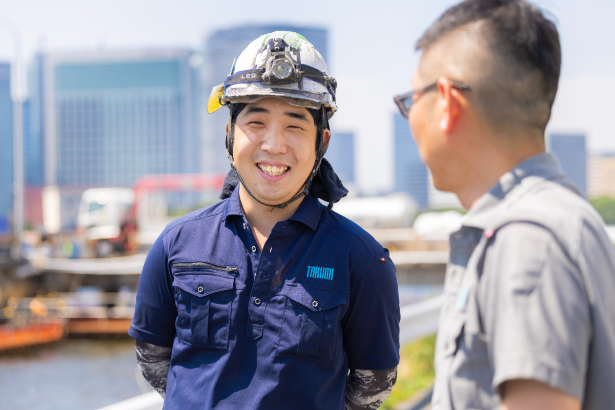 入社3年目の岡本さんは、未来の東京を創造する大型再開発の現場で、内装解体の仕事を行っています。「入社した時は全くの未経験だったので、右も左もわからない状態でした。でも、上司や先輩と後輩の仲が良い会社なので、自然と馴染むことができました。3年経って仕事にも慣れましたが、目標は社長の跡を継ぐことなので(笑)、目標の達成まではまだまだ時間がかかりそうです。自分にとって社長はかけがえのない存在なので、もし社長が変わることがあったら、自分も辞めてしまうんじゃないかと思うくらい尊敬しています。仕事だけでなく、プライベートの悩みも聞いてくれますし、結婚をする時に相談に乗ってもらえたことは一生忘れないと思います」。